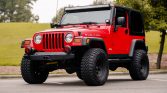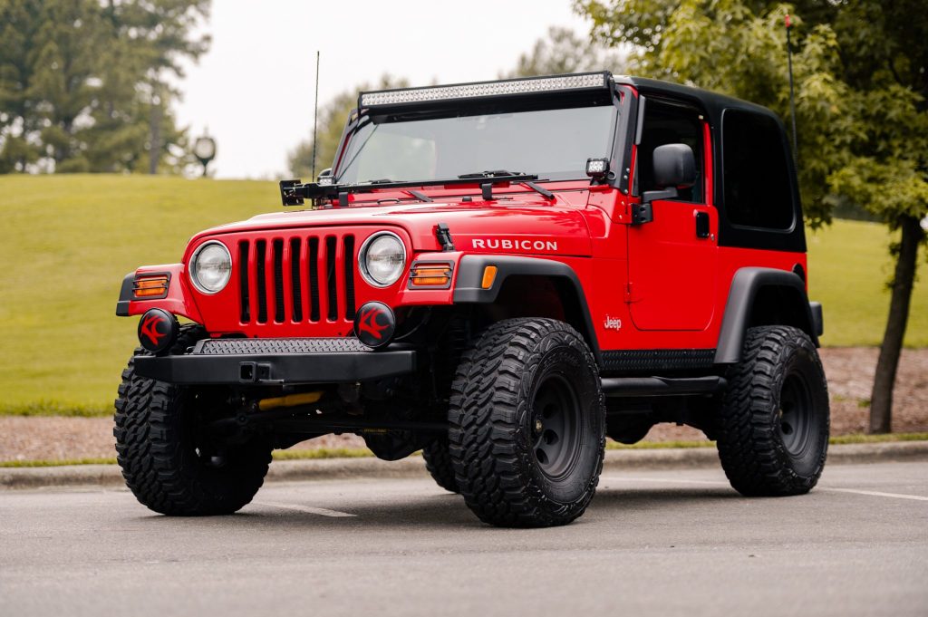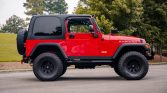 This 2003 Jeep Wrangler Rubicon is powered by a 5.3-liter Vortec V8 mated to a five-speed manual transmission and a two-speed transfer case. The truck is finished in red over gray patterned cloth upholstery, and equipment includes a black hardtop, 33″ tires mounted on 15″ ProComp wheels, locking differentials, aftermarket bumpers with recovery points, LED lighting, running boards, an aluminum radiator, and an aftermarket air intake. The truck was first registered in Texas and later spent time in Colorado and North Carolina prior to the seller’s recent acquisition.