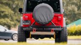 Black 15″ ProComp wheels are mounted with 33×12.5″ ProComp Xtreme MT2 tires, and a covered spare is mounted to an aftermarket swing-out carrier at the rear. The suspension has been fitted with a lift kit and Old Man Emu shocks.
