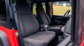 The truck is finished in red and equipped with a black hard top, full-frame metal doors, and black fender flares. Modifications include aftermarket bumpers with recovery points, tubular nerf bars, KC fog lights, an LED light bar, a hood-mounted jack, and a CB antenna.