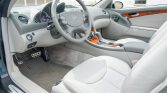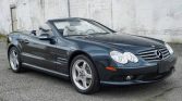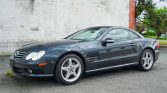 This 2003 Mercedes-Benz SL500 is finished in Green Black Metallic over gray leather and is powered by a 5.0-liter V8 paired with a five-speed automatic transmission. Equipment includes a retractable hardtop, 18″ AMG five-spoke wheels, the AMG styling package, xenon headlights, Keyless-Go, heated and power-adjustable seats, burred walnut trim, dual-zone automatic climate control, and a premium Bose sound system with a CD changer.