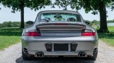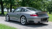 The 996 Turbo features side air intakes, revised front and rear bumpers, and wider rear bodywork in comparison to the contemporary 996 Carrera. This example is finished in Seal Grey Metallic and is equipped with bi-xenon headlights, a sunroof, a speed-activated rear spoiler, heated windshield washers, a rear wiper, and stainless-steel exhaust pipes.