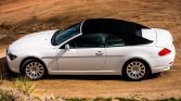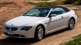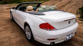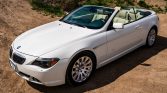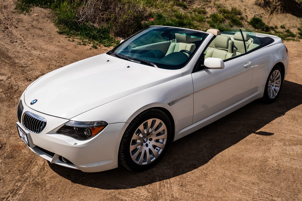 This 2004 BMW 645Ci convertible is finished in Alpine White over Cream Beige leather and powered by a naturally aspirated 4.4-liter V8 paired with a six-speed manual transmission. Equipment includes a power-operated black soft top, adaptive xenon headlights with washers, Dynamic Drive, a heated steering wheel, Logic 7 premium audio with a six-disc CD changer, and power-adjustable heated front seats. Work in the past two years included replacement of the clutch and flywheel as well as a recent brake fluid flush and oil change.