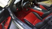 The seats are trimmed in black leather with red inserts, complemented by matching door panels and red carpets. Equipment includes push-button start, cruise control, air conditioning, aluminum pedal covers, power aLessories, and a factory CD stereo concealed behind an aluminum-look fold-away door.