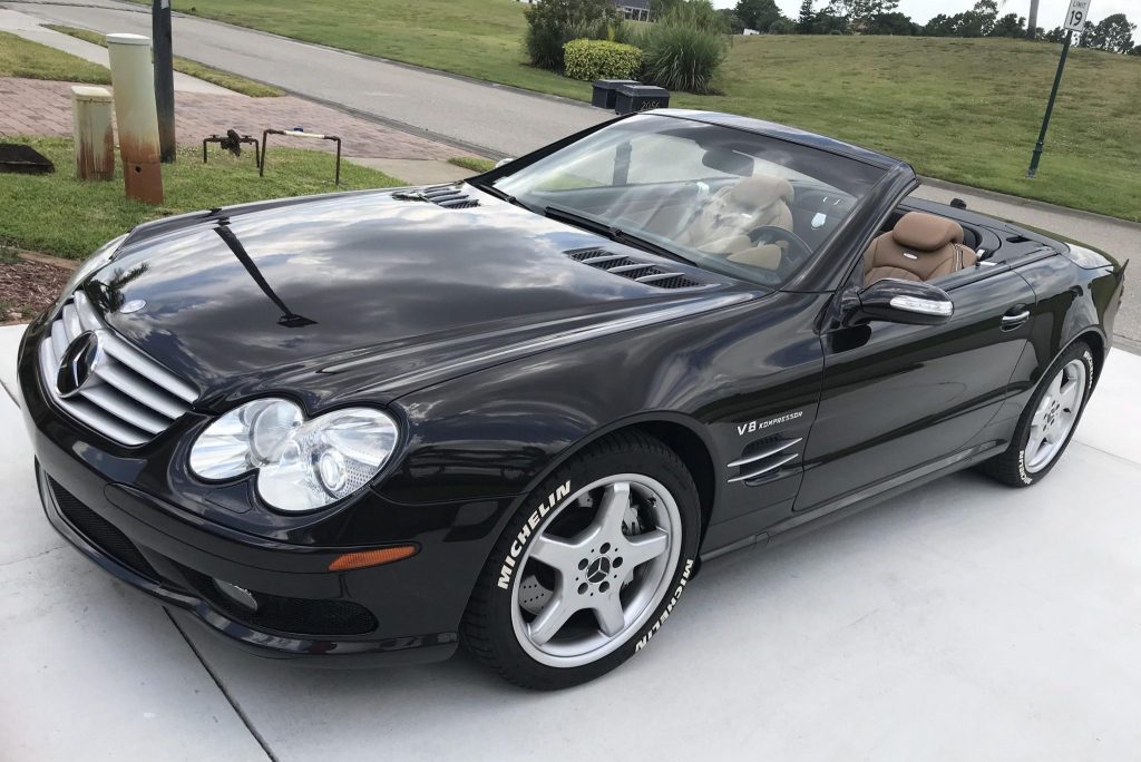 This 2004 Mercedes-Benz SL55 AMG is finished in designo Mocha Black Metallic over a designo Sand leather interior and is powered by a supercharged 5.4-liter V8 paired with a five-speed automatic transmission. Equipment includes a retractable hardtop, 18″ AMG wheels, bi-xenon headlights, Active Body Control suspension, heated power-adjustable seats, Distronic cruise control, Keyless GO, designo wood trim, automatic climate control, Bose audio, and COMAND infotainment with navigation.