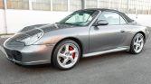 This 2004 Porsche 911 Carrera 4S cabriolet was originally built for use as a demonstration vehicle and is powered by a 3.6-liter flat-six paired with a six-speed manual transaxle and all-wheel drive. Finished in Seal Grey Metallic over Graphite Grey, the car is equipped with a black soft top, Porsche Stability Management, a wind deflector, carbon-fiber interior trim, a Bose sound system, a six-disc CD changer, automatic climate control, xenon headlamps, fog lights, cross-drilled brake rotors, and…