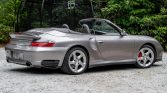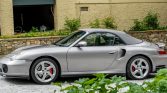 This 2004 Porsche 911 Turbo cabriolet is finished in Meridian Metallic over Graphite Gray full leather and is powered by a twin-turbocharged 3.6L flat-six paired with a six-speed manual transaxle and all-wheel drive. Equipment includes a power-retractable convertible top, a hard top, 18″ Turbo Twist wheels, power-adjustable front seats, and automatic climate control, while modifications reportedly consist of a GBox shift detent, braided clutch line and helper spring, aluminum diverter valves, and Evolution Motorsports Stage 1 clutch…
