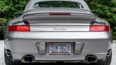 Staggered-width 18″ wheels wear Turbo center caps and are mounted with 225/40 and 295/30 Pirelli P Zero Rosso tires. Braking is handled by four-wheel discs with red multi-piston calipers.