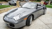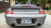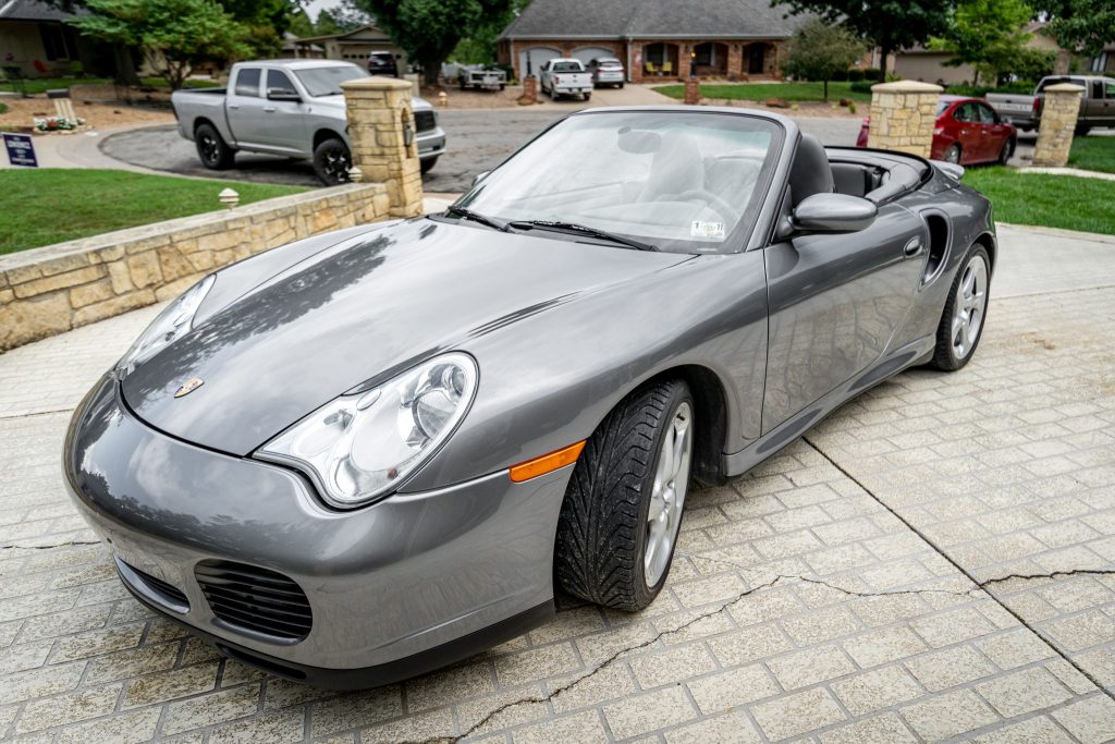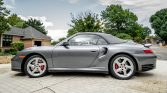 This 2004 Porsche 911 Turbo cabriolet is finished in Seal Grey Metallic over Graphite Grey full leather and is powered by a twin-turbocharged 3.6L flat-six powering all four wheels through a five-speed Tiptronic S automatic transaxle. Additional equipment includes a power-retractable convertible top, Porsche Stability Management, a Sirius satellite radio receiver, a factory stereo with a CD changer, power-adjustable front seats, stainless steel tailpipes, and 18″ Turbo Twist wheels. The car was first registered in Texas and later moved to Kansas before being acquired by the seller in 2020.