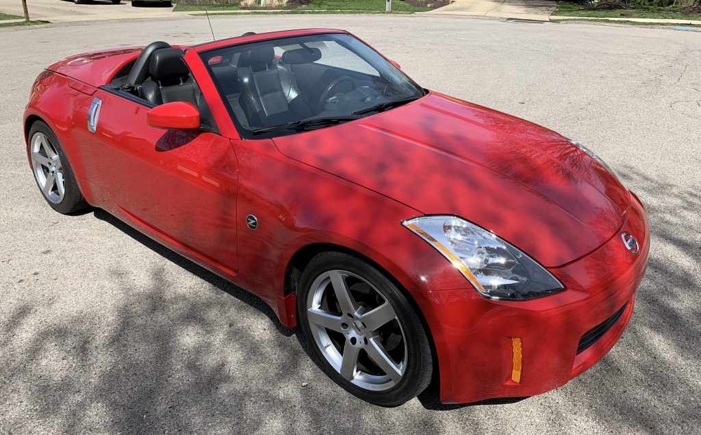 This 2005 Nissan 350Z Touring roadster is finished in red over black leather and powered by a 3.5-liter V6 paired with a six-speed manual transmission. Equipment includes a power-operated black soft top, 18″ TSW wheels, power-adjustable heated seats, automatic climate control, and a Bose stereo. The car was acquired a decade ago by the seller, who has since added approximately 10k of the 28k indicated miles. An oil change was performed in September 2020 and the car was last inspected in April 2021.