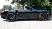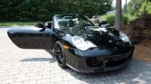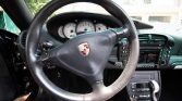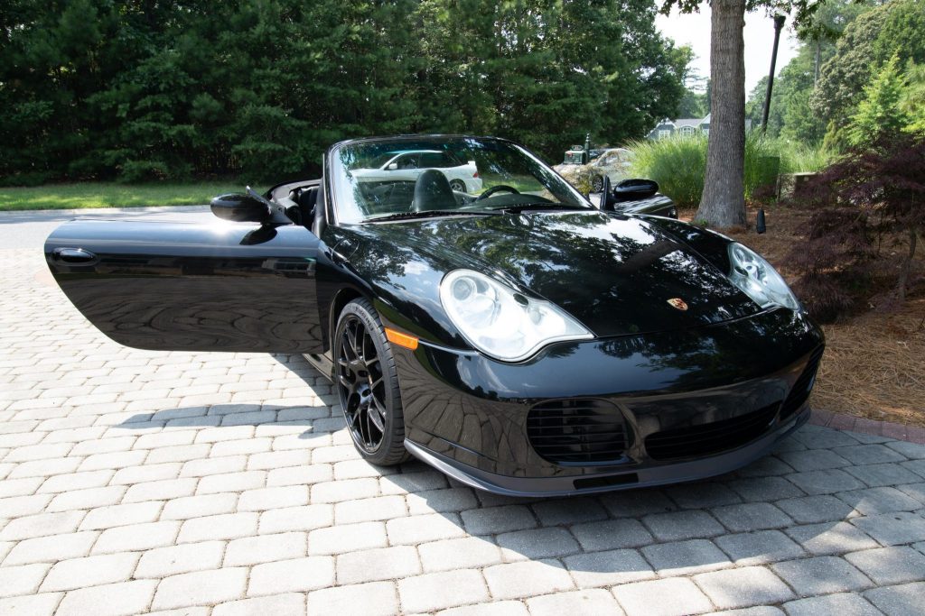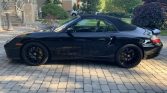 This 2005 Porsche 911 Turbo S cabriolet is finished in black over black leather and is powered by a twin-turbocharged 3.6-liter flat-six paired with a five-speed Tiptronic transaxle and all-wheel drive. Equipment includes a black soft top, 19″ wheels, Porsche Ceramic Composite Brakes, a speed-activated rear spoiler, heated seats, automatic climate control, and a navigation system.