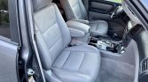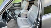 The cabin features seating surfaces upholstered in gray leather with matching door panels and carpeting. Amenities include power-adjustable and heated front seats, automatic climate control, cruise control, navigation, a JBL audio system with a six-CD changer, and a DVD player connected to a fold-down rear entertainment screen.