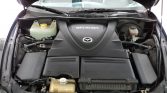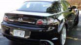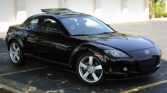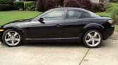 The RX-8 was designed under Ikuo Maeda, son of the lead designer for the first-generation RX-7, and features a pair of rear-hinged “freestyle” rear doors. This example is finished in Brilliant Black (A3F), and the seller notes a blemish on the top edge of the aluminum hood.