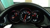 A leather-wrapped multifunction steering wheel fronts instrumentation that consists of a central 9k-rpm tachometer, a digital speedometer, and gauges for temperature, oil pressure, and fuel level. The seller states that the coolant level warning light remains illuminated. The digital odometer indicates 38k miles.