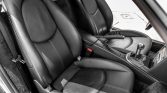 The cabin features heated seats upholstered in black leather with a matching dashboard, center console, and door panels. The optional Sport Chrono Package Plus adds an analog chronograph with an integrated digital clock atop the dashboard, and additional amenities include air conditioning, cruise control, Bose surround sound, PCM with navigation and phone, and Porsche-branded floor mats.