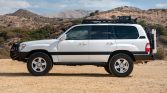 This 2006 Toyota Land Cruiser is finished in white over beige and is powered by a 4.7-liter V8 paired with a five-speed automatic transmission, a dual-range transfer case, and a locking center differential. Equipment includes a sunroof, an aftermarket roof rack, an ARB front bumper with a Warn winch, a Slee rear bumper and tire carrier, Slee rock sliders, a dual battery system, aftermarket LED fog and roof lights, ARB front and rear air lockers, heated front…