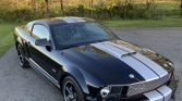 This 2007 Ford Mustang Shelby GT is one of approximately 5,800 built for the 2007 model year and was acquired by the seller in 2016. The car is finished in black with silver stripes over a dark charcoal leather interior, and power is provided by a 4.6-liter V8 paired with a five-speed manual transmission. Equipment includes a limited-slip differential, Ford Racing Handling and Power Upgrade packages, a hood scoop, air conditioning, and a Shaker 500 CD stereo. The…