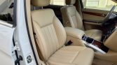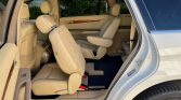 The interior houses three rows of seating upholstered in tan imitation leather with a matching lower dashboard, door panels, and carpeting. Cognac MB-Tex trims the upper dashboard, door handles, and steering wheel, and Bird’s Eye wood accents adorn the dash, center console, and door panels. Amenities include heated front seats, dual-zone automatic climate control, COMAND infotainment with navigation, Harman Kardon sound, black rubber floor mats, and second-row captain’s chairs.