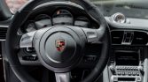 Aftermarket 19″ Zone wheels feature center caps with colored Porsche crests and wear Pirelli P Zero Rosso tires measuring 235/35 up front and 295/30 out back. Braking is handled by red Porsche-branded calipers clamping cross-drilled rotors at all four corners. The seller notes that the tire pressure light is on.