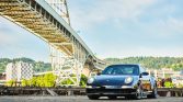 The seats are upholstered in black leather and are joined by a color-matching dashboard, door panels, and carpets. Amenities include the Sport Chrono package, power-adjustable and heated front seats, cruise control, automatic climate control, Bose audio, and a Sony head unit with Apple CarPlay integration. The Targa featured additional storage behind the rear seats, which is aLessible from beneath the rear hatch glass.