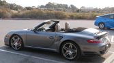 This 2008 Porsche 911 Turbo Cabriolet was first delivered to Carlsen Porsche in Redwood City, California, and it was purchased new by the seller and now has under 86k miles. It is finished in Meteor Grey Metallic over a two-tone black and Sand Beige interior and powered by a twin-turbocharged 3.6L flat-six driving all four wheels through a six-speed manual transaxle. Equipment includes a power-operated black soft top, 19″ wheels, fog lights, the Sport Chrono Package Turbo,…
