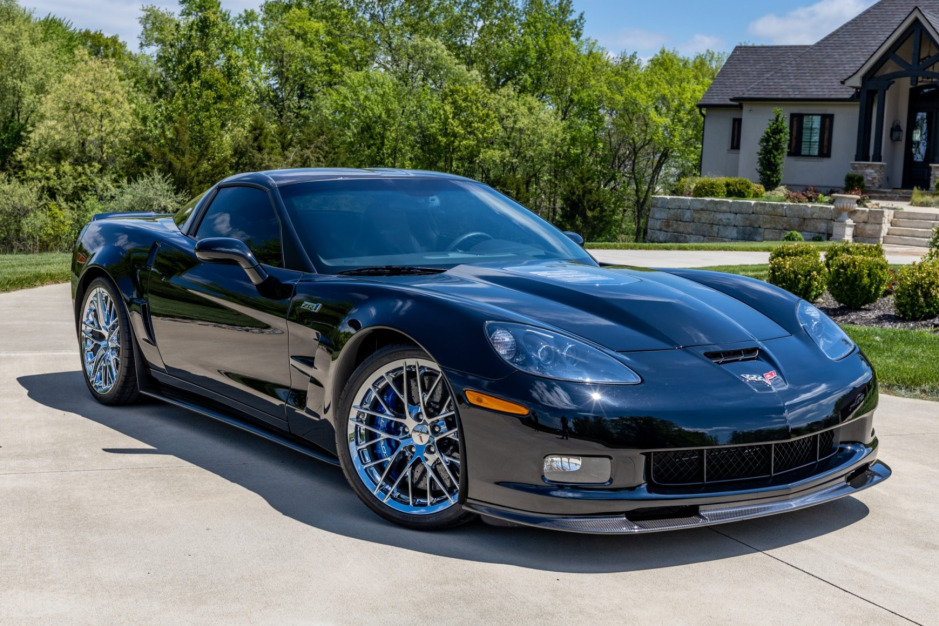 This 2010 Chevrolet Corvette ZR1 is powered by a supercharged 6.2-liter LS9 V8 paired with a six-speed manual transaxle and a limited-slip differential, and is finished in black over black leather. Equipment includes the 3ZR Premium Equipment Group, which added extended leather upholstery, a Bose audio system, power-adjustable and heated seats with memory settings, a power-telescoping steering wheel, Bluetooth connectivity, and navigation along with staggered chrome wheels, carbon-ceramic brake rotors with Brembo calipers, Magnetic Select Ride Control, and dual-zone climate control.
