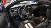 The cabin features seats upholstered in Charcoal Black leather with white center stripes and embossed backrests. The driver’s seat is power-adjustable, and other equipment includes dual-zone automatic climate control, cruise control, and a Sync infotainment system with a CD player, satellite radio connectivity, and Shaker audio.