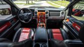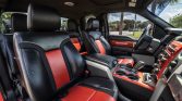 Black-finished 20″ HRE wheels are mounted with 37×13.50″ Hankook DynaPro MT tires. The brakes have been upgraded with a Brembo big brake kit up front and rear discs with red caliper covers. SVT Raptor models were equipped from the factory with revised suspension components that included SVT Fox dampers, and this example has been further modified with a 3″ body lift, modified front shock mount perches, Deaver 11-leaf rear leaf springs with Dirt King shackles, an ADD rear frame brace, and Fox air bump stops.