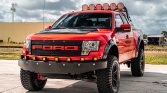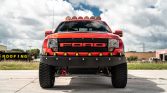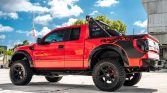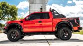 This 2011 Ford F-150 SVT Raptor SuperCab is finished in Molten Orange Tri-Coat over black and orange upholstery and is powered by a 6.2-liter V8 mated to a six-speed automatic transmission and a dual-range transfer case. The truck has been modified with 20″ HRE wheels, 37″ Hankook tires, a Brembo front big brake kit, a 3″ body lift, Deaver rear leaf springs, Fox air bump stops, a Kooks exhaust system, an Airaid intake, aftermarket bumpers, a chase…