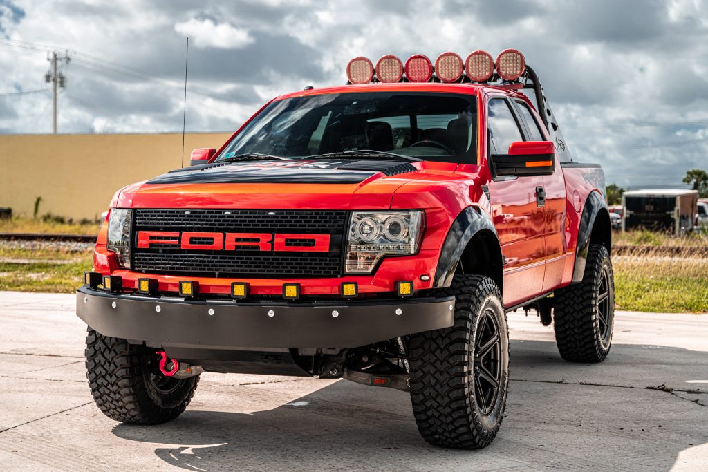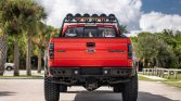 This 2011 Ford F-150 SVT Raptor SuperCab is finished in Molten Orange Tri-Coat over black and orange upholstery and is powered by a 6.2-liter V8 mated to a six-speed automatic transmission and a dual-range transfer case. The truck has been modified with 20″ HRE wheels, 37″ Hankook tires, a Brembo front big brake kit, a 3″ body lift, Deaver rear leaf springs, Fox air bump stops, a Kooks exhaust system, an Airaid intake, aftermarket bumpers, a chase rack, LED auxiliary lighting, aluminum skid plates, custom-painted fender flares, power-folding side steps, and a bed-mounted tire carrier. Factory equipment includes a sunroof, SVT Fox racing dampers, a reverse camera, an integrated trailer brake, and automatic climate control.