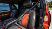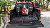 The truck is finished in Molten Orange Tri-Coat and features rear-hinged rear doors, a vented hood, flared composite fenders, flared bed-sides, hood and side graphics, and wheel arch extensions that have been refinished with a skull graphic. Additional modifications include aftermarket headlights and taillights, body-colored grille lettering, an aftermarket front bumper with eight LED lights, an ADD chase rack with front and rear-facing LED lighting, an ADD rear bumper with reverse spot lights, Amp Research power folding side steps, tinted glass, a high-lift jack mount, a spray-in bedliner, and a bed-mounted SDHQ tire carrier with two stock spares and jugs for fuel and water.