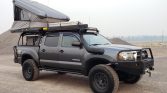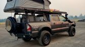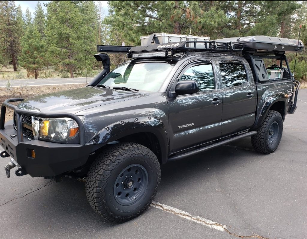 This 2011 Toyota Tacoma TRD Double Cab is finished in metallic gray over gray and is powered by a 4.0-liter V6 paired with a five-speed automatic transmission and a dual-range transfer case. Equipment includes front and rear locking differentials, Aluminess front and rear bumpers, a Warn winch, All-Pro skid plates, All-Pro Extreme sliders, a roof rack, a light bar, driving lights, a snorkel, a console safe, a CB radio, a CD stereo, cruise control, and air conditioning. A James Baroud hardshell tent is mounted to a Leitner Designs cargo rack, and additional bed modifications include an awning, storage boxes, an Engel refrigerator, and a 30-gallon water tank. The truck was featured in Issue #32 of OutdoorX4 Magazine, and it resided in Oklahoma before it was acquired by the current owner and relocated to Oregon in 2019.