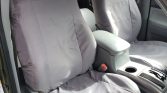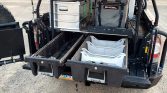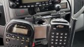 The cabin features gray cloth seat covers over gray cloth upholstery. Equipment includes air conditioning, cruise control, a CD stereo, a Tech Deck accessory mounting system, RAM mounts, a Cobra 75WX CB radio, a Rugged Radios RM50 UHV-VHF radio, a Lock’er Down console safe, Toguard CE60 front and rear cameras, and WeatherTech floor mats.