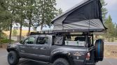 A Leitner Designs active cargo system is mounted in the bed and is fitted with a James Baroud hardshell tent, a 30-gallon water tank, a water pump and accumulator, a decked cargo drawer system, an Eezi-Awn drop-down fridge slide, an Engel 45 refrigerator, and an Alu-Box storage box.
