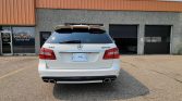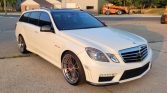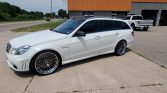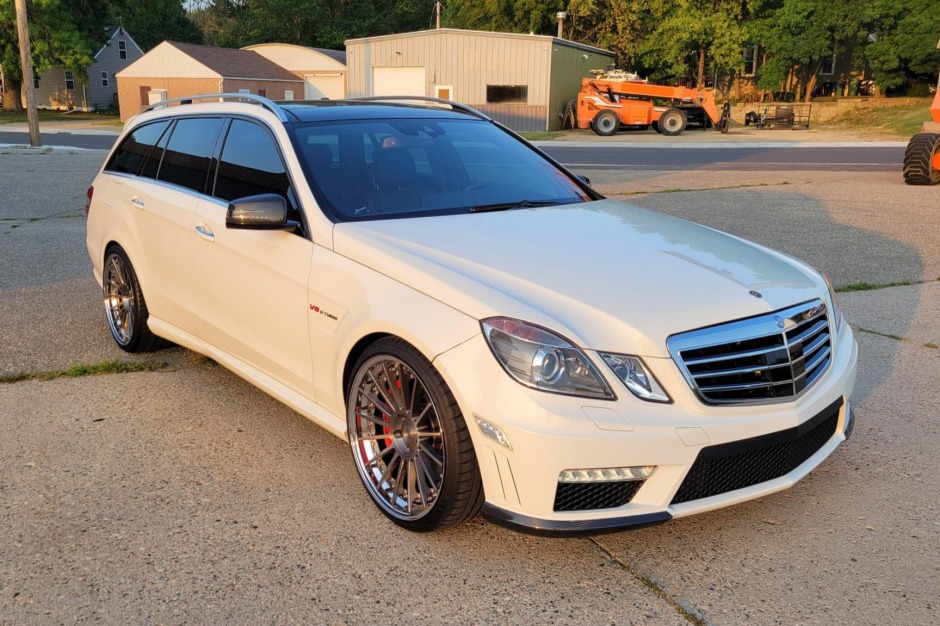 This 2012 Mercedes-Benz E63 AMG Wagon is finished in white over black leather and powered by a twin-turbocharged 5.5-liter V8 paired with a seven-speed automatic transmission and a limited-slip differential. Factory equipment includes the P30 Performance package, a panoramic glass sunroof, heated and ventilated Dynamic front seats, carbon fiber exterior and interior trim, Keyless-GO, a premium audio system, and a dual-screen rear seat entertainment system as well as the Driver Assistance and Exclusive packages. Modifications are said to include 20″ Rotiform wheels, an aftermarket rear spoiler, Stage 2 engine management software, titanium downpipes, and an Alpha Performance carbon fiber intake system. The car was sold new by Mercedes-Benz of Laguna Niguel in California, and remained registered in the state until it was acquired by the seller in May 2021. Subsequent work has reportedly included replacement of the rear main seal along with changes of the transmission fluid and engine oil.