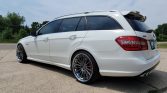 This 2012 Mercedes-Benz E63 AMG Wagon is finished in white over black leather and powered by a twin-turbocharged 5.5-liter V8 paired with a seven-speed automatic transmission and a limited-slip differential. Factory equipment includes the P30 Performance package, a panoramic glass sunroof, heated and ventilated Dynamic front seats, carbon fiber exterior and interior trim, Keyless-GO, a premium audio system, and a dual-screen rear seat entertainment system as well as the Driver Assistance and Exclusive packages. Modifications are said…