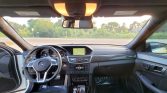 The cabin features heated and ventilated Dynamic front seats upholstered in black leather, matching carpets, and gloss carbon fiber trim on the dashboard and doors. Equipment includes a panoramic glass sunroof, dual-zone automatic climate control, COMAND infotainment with navigation, a back-up camera display, electric lateral rear sunshades, Keyless-GO, a premium sound system, and a two-screen rear entertainment system. The Driver Assistance package adds Distronic adaptive cruise control, Blind Spot Assist, and Lane Keeping Assist.