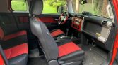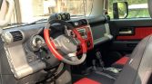 The cabin features water-resistant Dark Charcoal fabric upholstery with red inserts as well as a matching dashboard and door panels. Additional amenities include FJ-branded rubber mats, air conditioning, power windows and door locks, a Trail Teams badge on the dashboard, a CD stereo with Bluetooth and USB input, and a backup camera screen in the rearview mirror.