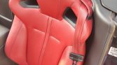 The heated and power-adjustable performance seats are upholstered in red leather, and matching upholstery extends to the lower dashboard and center console. Equipment includes dual-zone automatic climate control, cruise control, a heated steering wheel, a wind deflector, roll hoops, aluminum pedal covers, configurable dynamic driving mode controls, and a Meridian 770-watt 14-speaker multimedia stereo with satellite radio and Bluetooth connectivity.