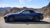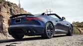 The body is finished in dark blue and features a power-operated black soft top along with gloss black accents on the grille, mirror caps, and fender and hood vents. Additional exterior equipment includes front and rear parking sensors, Union Jack decals on the rear fenders, and quad exhaust tips exiting through the rear fascia. The front grille and rear Jaguar emblem have been wrapped in black, and the rear bumper badges have been removed.