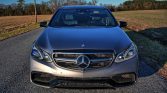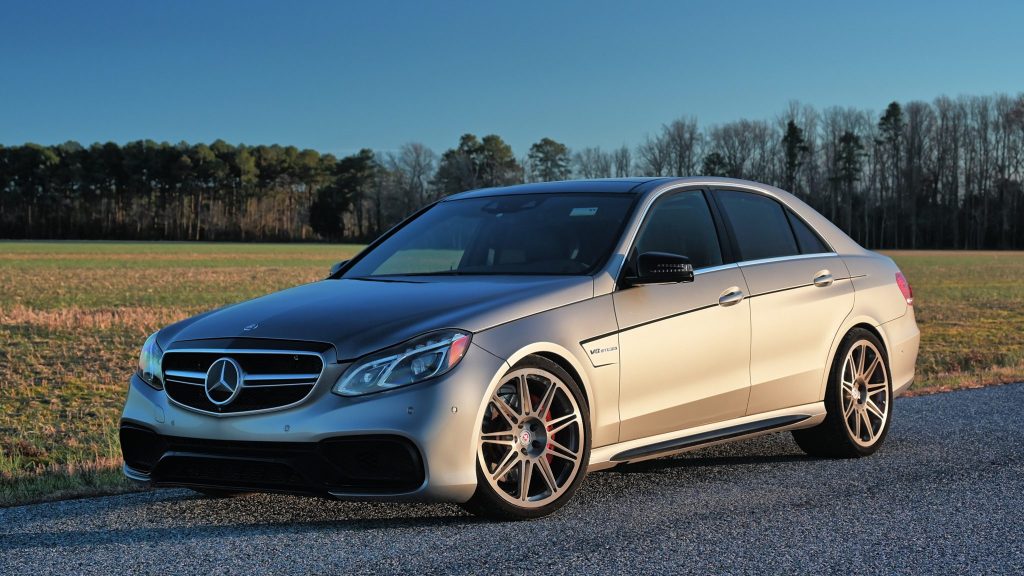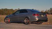 This 2014 Mercedes-Benz E63 S AMG sedan is powered by a twin-turbocharged 5.5-liter V8 mated to a seven-speed automatic transmission and a 4MATIC all-wheel-drive system. The car is finished in silver over black leather and equipment includes 20″ HRE wheels, an aftermarket air intake, a panoramic sunroof, heated and ventilated front seats with position memory, COMAND with navigation, and a 360-degree camera. RENNtech modifications included an R1 ECU tune, a transmission upgrade, a diverter valve kit, and a carbon-fiber rear spoiler.
