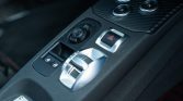 The cabin features bucket seats upholstered in black leather with microfiber inserts and contrasting red stitching, and matching upholstery covers the dashboard. Exposed carbon fiber adorns the console, door sills, and instrument panel surround, and amenities include cruise control, rear park assist, 4C-branded floor mats, and power locks and windows. Scuffs are visible on the paint protection film covering the driver’s door sill.