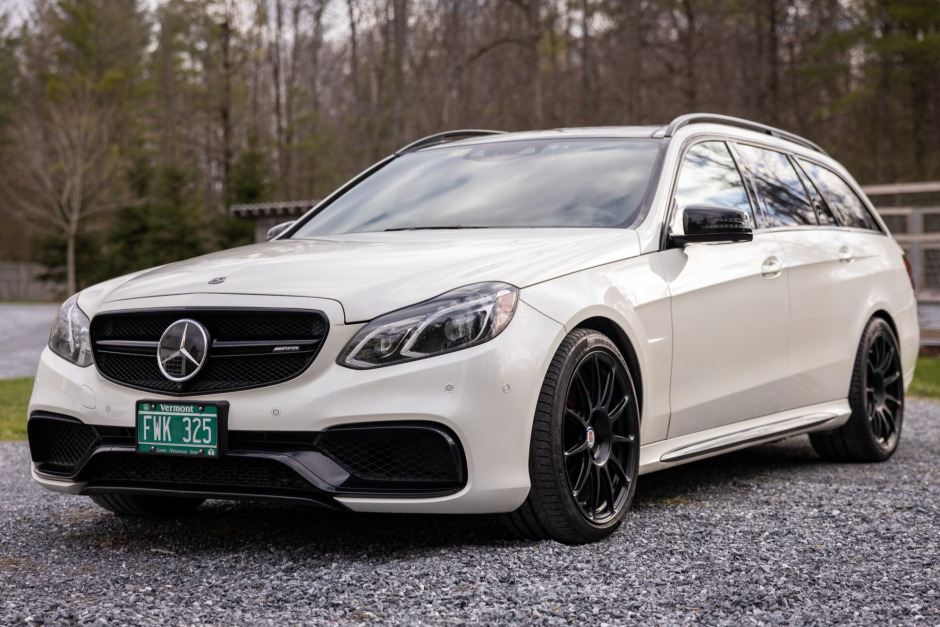 This 2015 Mercedes-AMG E63 S 4MATIC is provided by a twin-turbocharged 5.5-liter V8 paired with a seven-speed automatic transmission and 4MATIC all-wheel drive, and the car is finished in Diamond White over black Nappa leather. Equipment includes AMG Exterior Night Styling, black-finish 19″ HRE wheels, red-finished brake calipers, a panoramic sunroof, a hard-wired Valentine One radar detector, the Driver Assistance and Parking Assist packages, power-adjustable multi-contour front seats with memory, and COMAND infotainment with navigation and a Harmon Kardon surround-sound system.