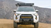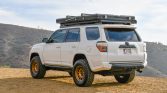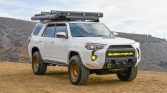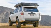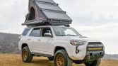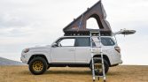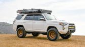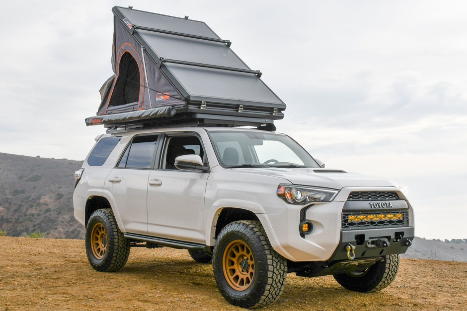 This 2016 Toyota 4Runner Trail was sold new by Karl Malone Toyota in Draper, Utah, and later moved to California, where it was acquired by the current owner in 2021. The truck is finished in white over black cloth upholstery and is powered by a supercharged 4.0-liter V6 paired with a five-speed automatic transmission, a dual-range transfer case, and a locking rear differential. Modifications include 17″ Method wheels, King remote-reservoir shocks, Built Right upper control arms, a Front Runner roof rack, a Roofnest clamshell tent, a Roam Adventure Co. awning, LED auxiliary lighting, a Smittybilt winch, an ARB air compressor, dual Optima batteries, a Dometic cooler, and a Pioneer head unit with OEM Audio subwoofers.