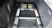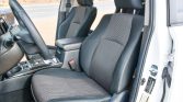 The cabin features black cloth upholstery with patterned inserts along with matching carpets and plastics on the dashboard and door panels. Multi-terrain Select and Crawl Control switches are housed in an overhead console, and additional equipment includes a power-adjustable driver’s seat, air conditioning, cruise control, a backup camera, a dual battery gauge, and an aftermarket 9″ Pioneer head unit connected to an aftermarket amplifier and OEM Audio dual subwoofers.