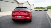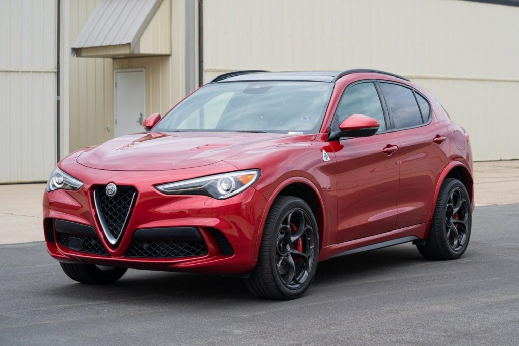 The Quadrifoglio features a revised hood, bumper covers, side skirts, and wheel arch flares versus the standard Stelvio along with a vented hood and Quadrifoglio fender badges. This example is finished in Rosso Competizione Tri-Coat, and additional features include bi-xenon headlights with washers, LED running lights and taillights, front and rear parking sensors, power-folding and heated side mirrors, black roof rails, and a dual-mode exhaust system with quad outlets.