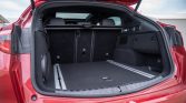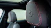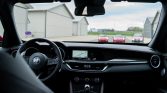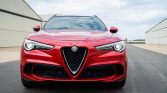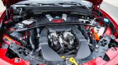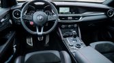 Dark-finished 20″ five-hole aluminum wheels wear monochromatic Alfa Romeo center caps and Goodyear tires measuring 255/45 up front and 285/40 out back. Factory equipment includes an active suspension as well as Brembo brakes with red-finished calipers over cross-drilled rotors.