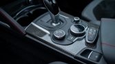 The cabin is upholstered in black leather and Alcantara with red aLent stitching on the dashboard, center console, steering wheel, seats, and door panels. Additional equipment includes the Driver Assist Dynamic Package, an Alfa DNA drive mode selector, an 8.8″ infotainment system with 3D navigation, a 14-speaker Harman Kardon audio system, carbon fiber trim, aluminum pedals, and power-adjustable and heated front seats.