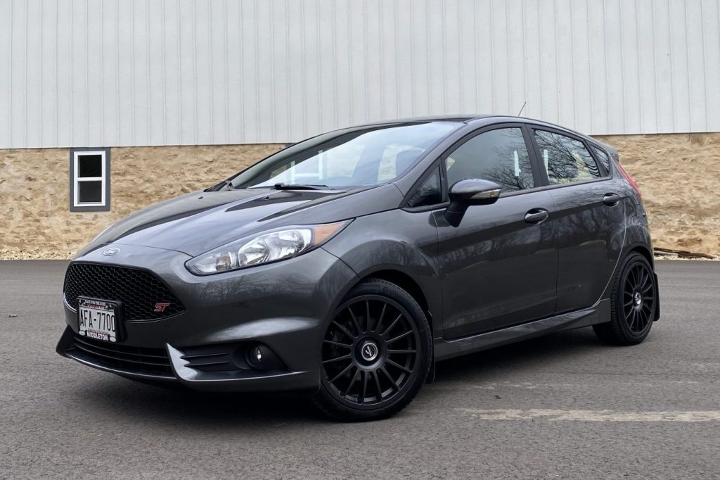 This 2019 Ford Fiesta ST was purchased new by the seller from Middleton Ford of Middleton, Wisconsin, and has 8k miles. The car is finished in Magnetic gray over Smoke Storm partial leather upholstery, and it is powered by a turbocharged 1.6-liter EcoBoost inline-four paired with a six-speed manual transaxle with Torque Vectoring Control. Equipment includes aftermarket 17″ wheels, fog lights, heated Recaro sport seats, a Sony Sync 3 stereo system, an engine block heater, a Mountune induction kit, and a COBB ALessport tuner.