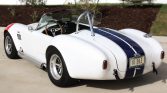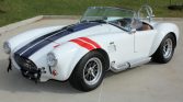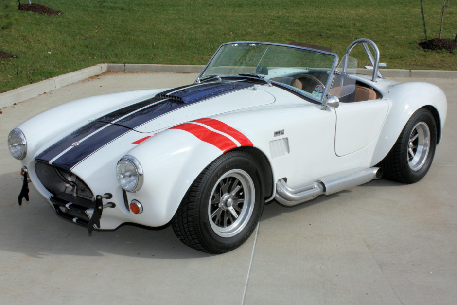 This Hurricane Motorsports Roadster is a Shelby Cobra replica that was acquired by the seller as a rolling chassis and assembled in June 2010. The car is finished in white with blue and red stripes over tan and is powered by a 432ci Ford FE V8 paired with a five-speed TKO600 manual transmission and a Ford Traction-Lok limited-slip differential. Additional equipment includes an independent front and rear suspension, 15″ Trigo knock-off wheels, QA1 adjustable coilovers, Mustang II-style rack-and-pinion steering, a SCAT stroker kit, Edelbrock cylinder heads, Borla fuel injection with individual throttle bodies, Performance Electronics engine management, an MSD Pro distributor, Lucas tri-bar headlights, heated bucket seats, and Simpson five-point harnesses. The tires were replaced in July 2019, and work in preparation for the sale consisted of updating the ECU firmware, resealing the intake manifold and valve covers, changing the oil, and replacing the driver-side headlight.