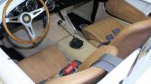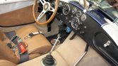 The cabin features low-back bucket seats trimmed in tan with matching door panels and carpets. Interior equipment includes heated seats, Simpson Racing five-point harnesses, wind wings, a heater and defroster, a dash-mounted center mirror, AC-branded clutch and brake pedals, a brake bias adjustment knob, a battery shut-off switch, black Cobra-branded floor mats, and a locking glovebox.